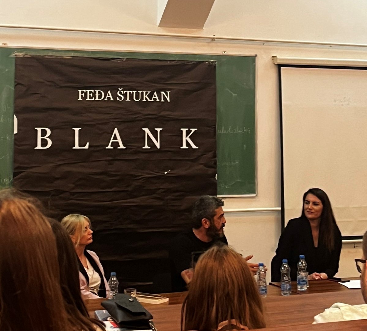 U punom amfiteatru Srednje stručne škole Fedja Štukan, glumac i pisac predstavio je svoj roman “Blank”. S obzirom na to da je “Blank” odnedavno u nekim razredima i fakultativna lektira, učenici su imali sijaset pitanja za autora. Razgovarali su o njihovom doživljaju djela, o ulogama u filmovima, kao i o njegovim hobijima, letenju i padobranstvu. Štukan je govorio o štetnosti droge, alkohola, navodeći svoja iskustva sa istim, ali i o opasnostima koje sa sobom nose nacionalne i vjerske podjele.