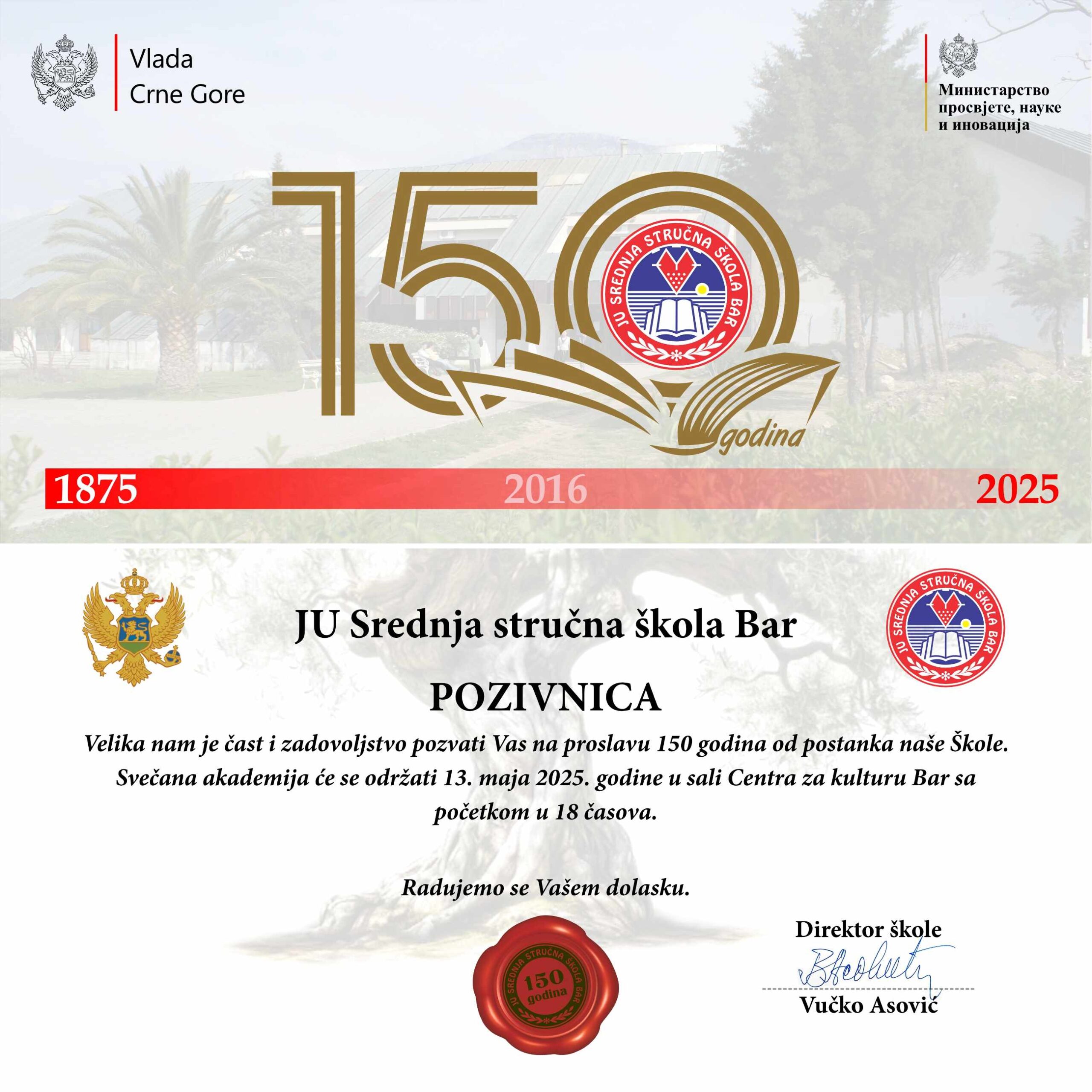 JU Srednja stručna škola 13.05.2025.god. obilježava 150 godina postojanja, u sali Centra za kulturu Bar, sa početkom u 18:00 časova. Tim povodom će premijerno biti prikazan dokumentarni film “Od Zemljodjelske do Srednje stručne škole”, u režiji profesorice Marije Šušter i Dejana Senića. Gostima će se obratiti direktor škole – Vučko Asović, državni sekretar MPNI – Dragan Marković, predsjednik Opštine Bar – Dušan Raičević. Specijalna gošća večeri je ambasadorka Sjedinjenih Američkih Država u Crnoj Gori – Džudi Rajzing Rajnke, a program će voditi pomoćnica direktora – profesorica Nevena Sjekloća.
