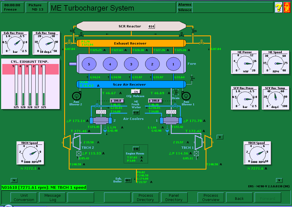 Simulaciju rada preko 60 sistema pogonskog motora, parametre stanja glavnog i generatorskih motora, kao i parametre rada velikog broja mašina i uređaja je moguće pratiti u situacijama pripreme glavnog motora, lagane vožnje naprijed, kao i vožnje punom snagom naprijed ili nazad .