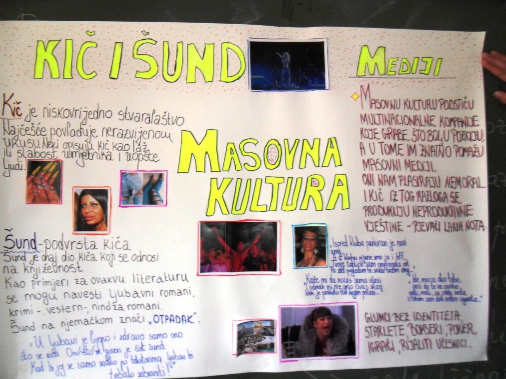 Час је почео кратким излагањем проблематике из свакодневног живота-коришћење слободног времена. Ученици су потом редоследом добро планираних активности израдили мапу ума о елитној и масовној култури, након чега су у фокус групи дискутовали о елитној култури, односно књижевности, умјетности, музици, архитектури, наводили њене основне карактеристике- ауторска, аутентична, оригинална, вриједна, скупоцена, доступна мањини, зато што је не може свако разумјети. Даље је дискусија настављена у правцу одређивања појма и карактеристика масовне, обичне, народне културе. Ученици су кроз вођени разговор објаснили ретроспективу настанка масовне културе (19.в. долазак сеоског становништва у град) и њене основне димензије- неауторска, неоригинална, мање вриједна, доступна свима (већини).